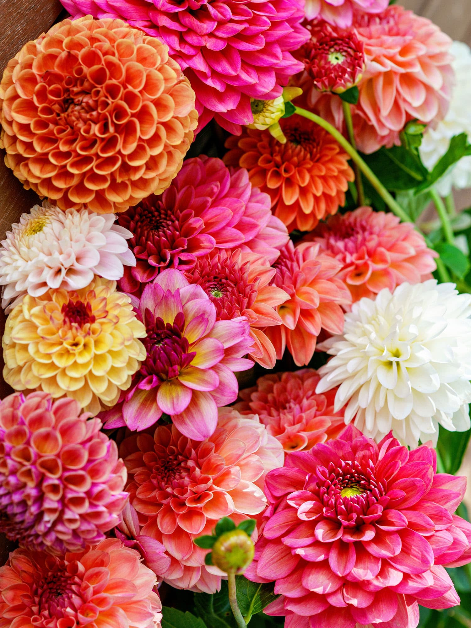 • Dahlias — With layered petals that look perfectly sculpted, dahlias bring a full, lush texture that mirrors summer gardens at their peak. They are abundant, with intricate textures that give arrangements a bold, artistic look grounded in the season. Available in vibrant pinks, corals, oranges, whites, and deep reds, dahlias reflect the vibrant color story of summer while adding depth and drama to bouquets and centerpieces.