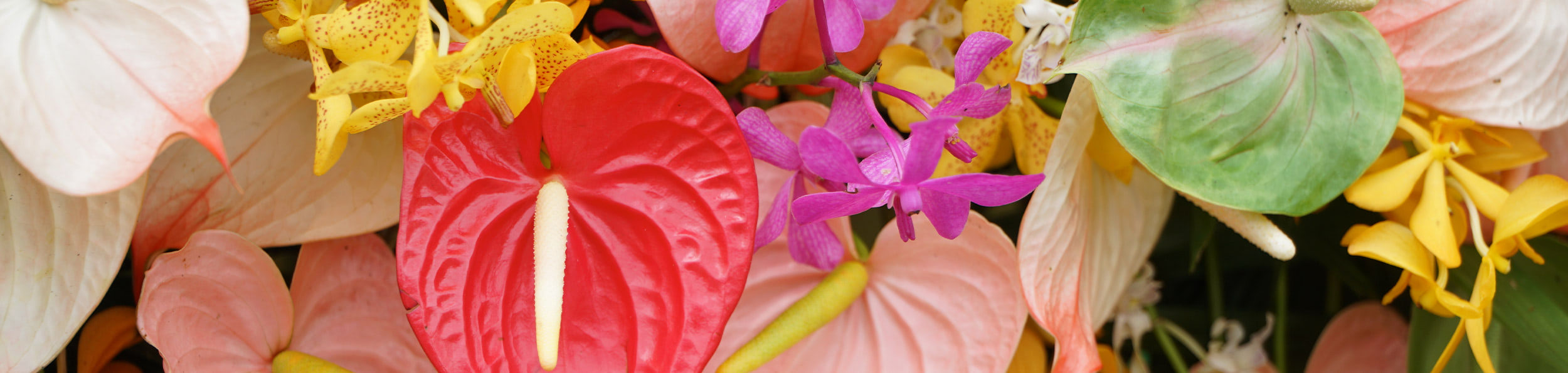 • Anthuriums — Whether green, pink, red, or white, these waxy, lacquered, heart-shaped tropical blooms are modern and editorial, bringing new shapes and texture to softer, delicate petals. These blooms are distinctly tropical in their shine, like sunlight reflecting off pool water or leaves after a humid afternoon rain. In summer arrangements, anthuriums add structure and a vibrant sense of personality, making arrangements feel current, sculptural, and full of warm-weather confidence.